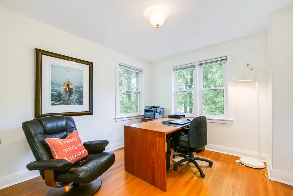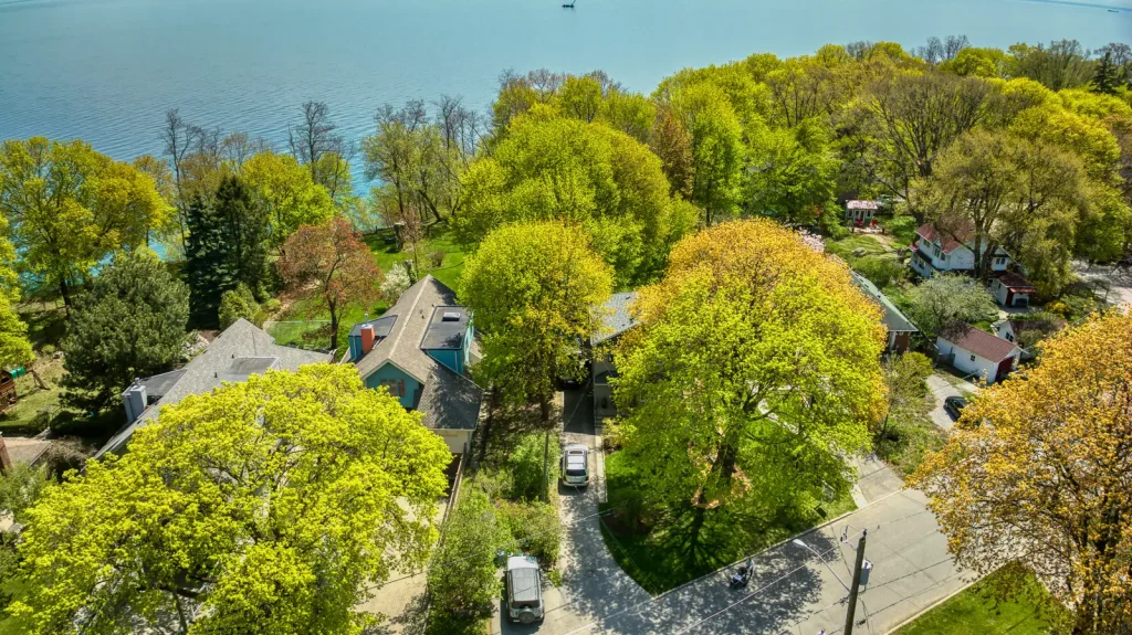 This lovely detached, two story home with an essence of Frank Lloyd Wright detailing provides for very functional living space with three generous sized bedrooms, two bathrooms and full height, finished lower level with a walkout to lush south facing lake top garden. Large, bright principal rooms with beautiful hardwood floors and windows at every turn, allow for the very special outdoor setting to come indoors.