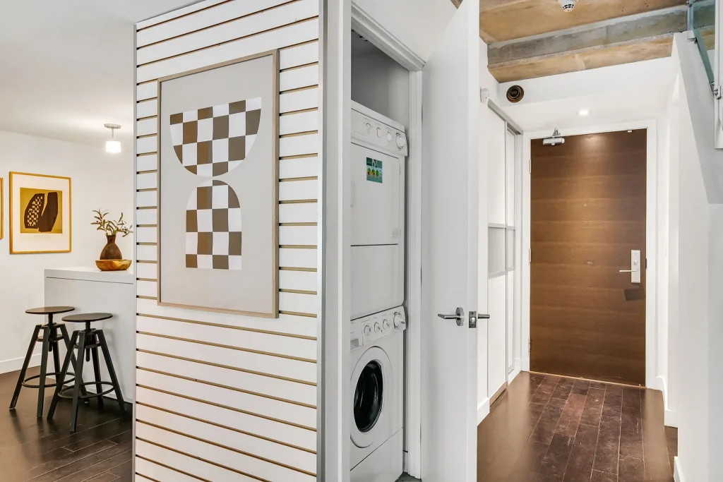 Included are stainless steel appliances in the kitchen, front loading full size washer and dryer, all attached electric light fixtures, all closet shelving and two parking spots.